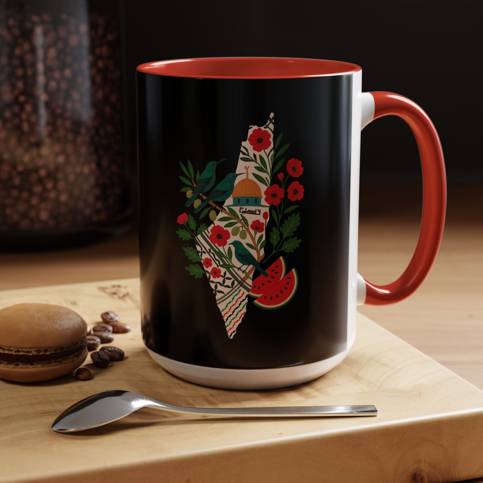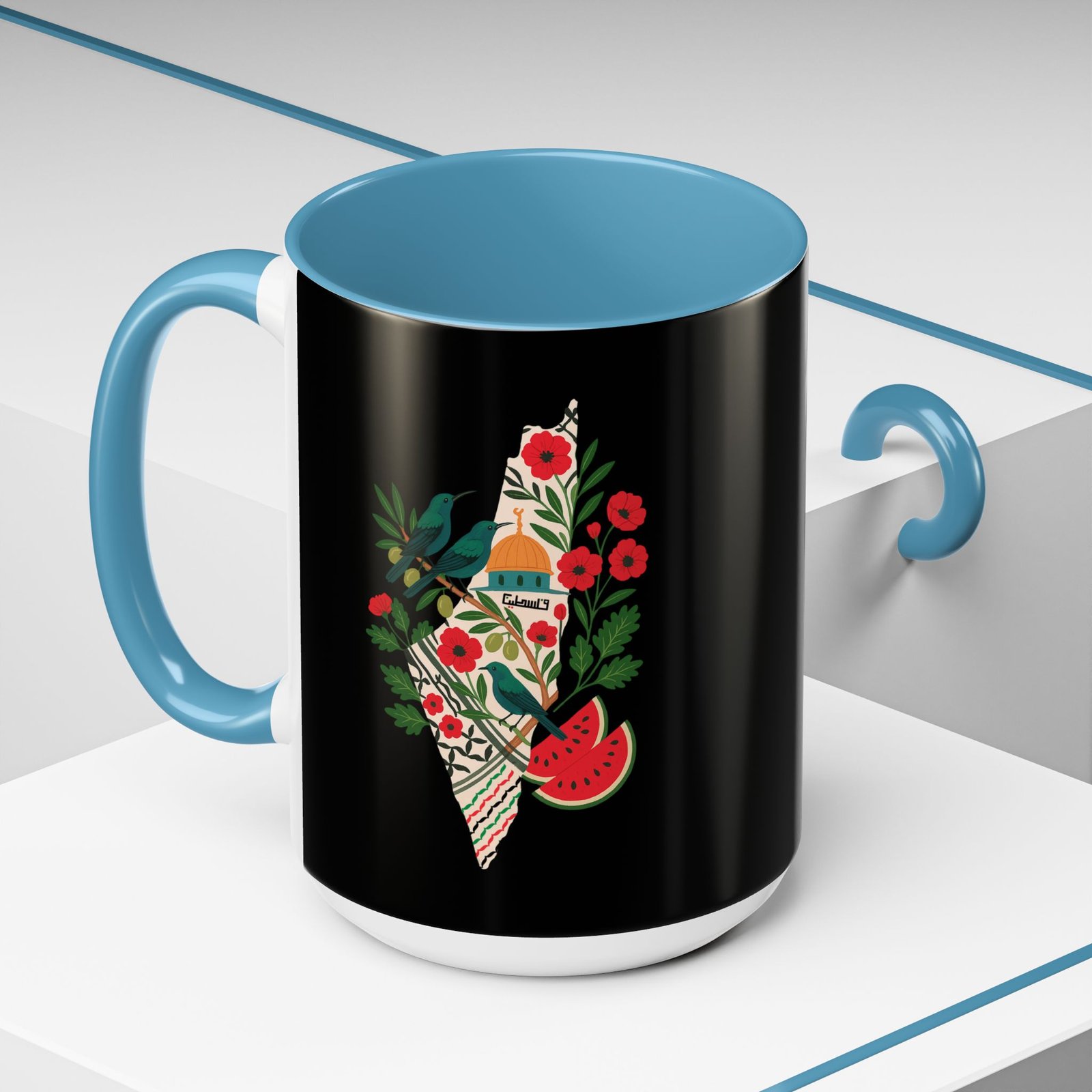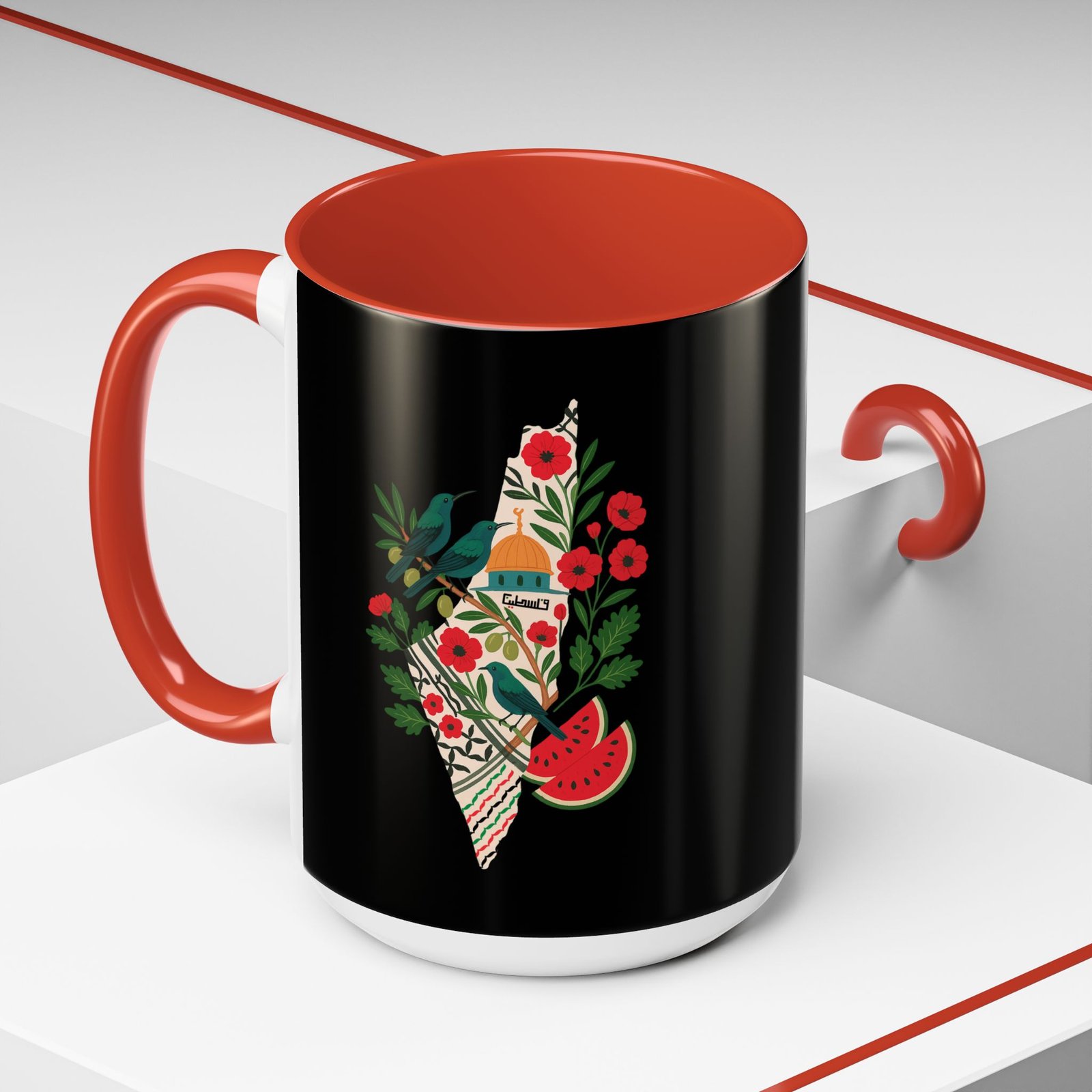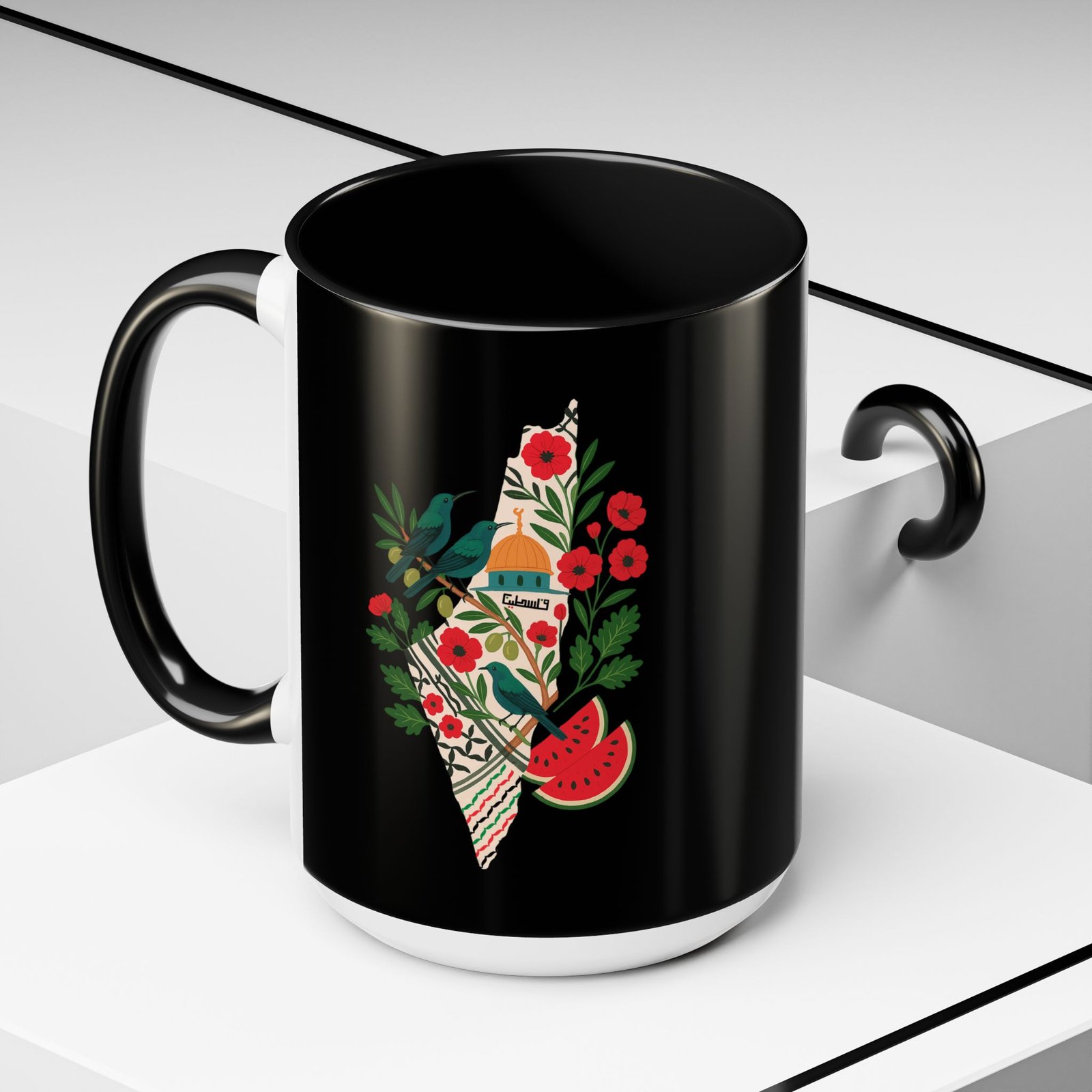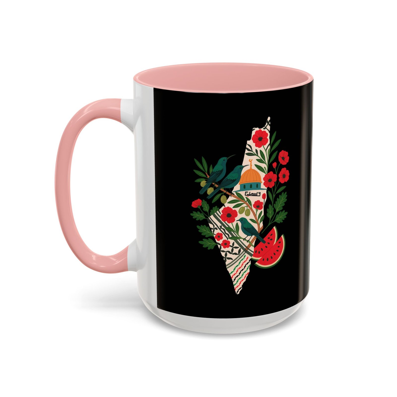 This Palestine Map Mug features a unique design showcasing Al Aqsa, Sunbird, Poppy Flower & Watermelon. Perfect for those interested in cultural heritage art, this mug adds a vibrant touch to your morning coffee routine. Ideal for individuals who appreciate artistic and meaningful designs, this mug is perfect for gifting during cultural celebrations and holidays.